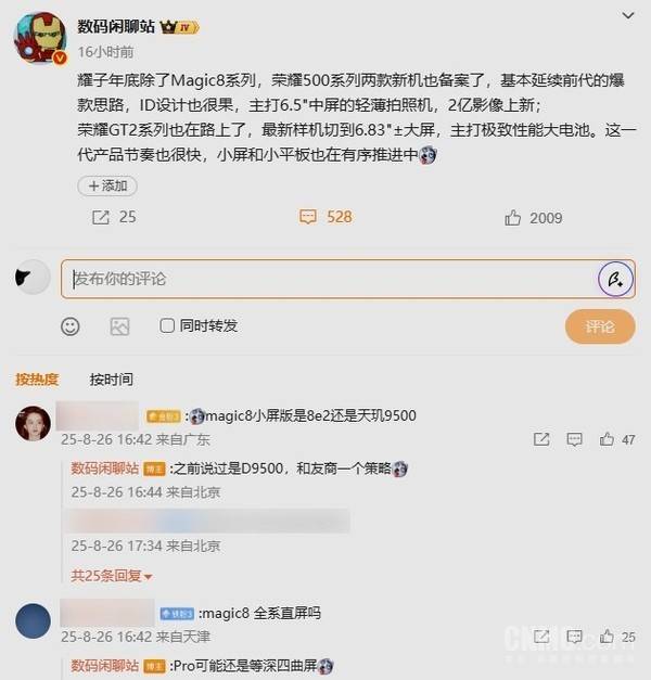 除了Magic 8系列,荣耀500系列也备受关注。该系列两款新机主打6.5英寸中屏轻薄设计,延续前代爆款思路,ID设计酷似苹果,同时重点升级了摄像头,像素高达2亿。而GT2系列方面,据博主透露,工程机已搭载6.83英寸1.5K直屏,定位“极致性能+大电池”,满足用户对高性能与长续航的双重需求。